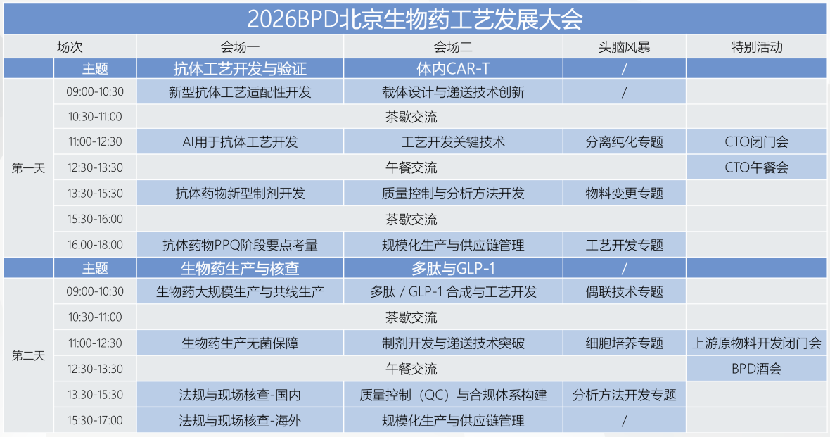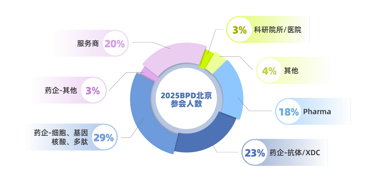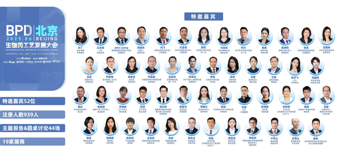 BPD生物药工艺发展大会,是聚焦生物药工艺开发到商业化生产全流程的行业标杆会议。BPD自2017年第一届会议举办以来,持续深耕前沿技术交流、产品与用户交互,联动产业上下游。 BPD通过覆盖生物医药细分产品赛道、拆分研发工艺质量生产等CMC细分环节、聚焦技术报告与案例分享等形式,以年会+地区精品会巡回的方式,推动全球各地区间生物药工艺技术交流。 BPD北京致力于推动北方地区生物药工艺交流,2025BPD北京已于2025年6月12-13日顺利闭幕,现场共计邀请52位演讲嘉宾、939位技术观众、数十家展商。